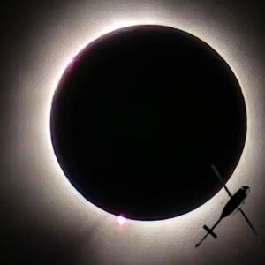 There were thousands of people at that location on October 14, 2023, in the middle of nowhere, who had telescopes, binoculars, and all sorts of cameras set up awaiting that moment when the Moon’s shadow passed directly overhead and the sky darkened a bit. Because this wasn’t considered a total eclipse of the Sun, a ring of bright red fire was clearly visible through our special dark solar eclipse glasses. These glasses were so dark, that unless you are looking directly at the Sun, everything looks pitch black. The reason the sky only darkened a little was because the Moon was a little farther from Earth that day.